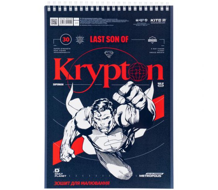 Складається з 30 білих ущільнених (100 г/м2) аркушів формату А4. Зошит виконаний на подвійній металевій спіралі. При бажанні подарувати свій шедевр, дитина з легкістю зможе дістати аркуш, не пошкодивши обкладинку. Ефект на обкладинці: гібр. лак + УФ лак