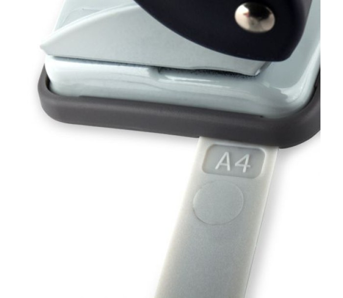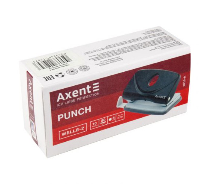 Діркопробивач Axent серії Welle-2 виділяється яскравим кольором і ергономічним дизайном рукоятки. Зроблений з якісного ABS-пластику - це сучасний матеріал міцний і легкий, не б'ється при падінні. Всі основні і робочі механізми - металеві, забезпечують надійну роботу діркопробивача. Леза довго залишаються гострими. Для зручності діркопробивач оснащений висувною обмежувальною лінійкою з точною шкалою форматів паперу (А3, А4, А5). Висувна лінійка необхідна для позиціонування аркушів паперу, які вставляються в діркопробивач, і дозволяє завжди отримувати точний результат і однакові стоси підшитих документів зі співпадаючими отворами. Знімний резервуар для конфетті відкривається м'яко. Прогумована підошва запобігає ковзанню діркопробивача по поверхні. Діаметр отвору 6 мм, відстань між пробитими отворами 80 мм.
