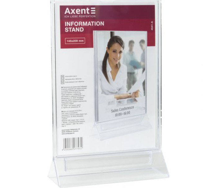 Двосторонні інформаційні таблички широко використовуються для розміщення реклами та іншої інформації при роботі з клієнтами - в банках, ресторанах (наприклад, спеціальні меню), на рецепції готелів, в салонах краси і т.д. Табличка інформаційна двостороння Axent виготовлена з кришталево прозорого пластику (полістиролу), який не порушує передачу кольору і чіткість зображень. Зручна виїмка для пальців дозволяє легко замінити вкладиш в табличці.