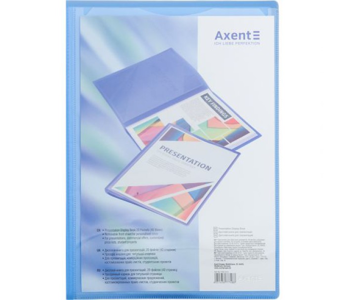 Дисплей-книги - це чудове рішення для роботи, навчання і організації особистих архівів, підбірок. Помістивши документи з певної теми або проекту в окрему дисплей-книгу, можна не тільки вирішити питання зручної систематизації та зберігання документів, але і при необхідності брати з собою і презентувати їх, просто гортаючи файли в дисплей-книзі. Дисплей-книги Axent виготовлені з первинного поліпропілену, щільність пластику обкладинки і файлів передбачає їх зносостійкість і збереження презентабельного вигляду в процесі використання. Файли надійно впаяні в обкладинку. Додатковий функціонал, прозора зовнішня кишеня, дозволяє розмістити власну титульну сторінку на обкладинку, викликаючи цікавість до змісту презентації.