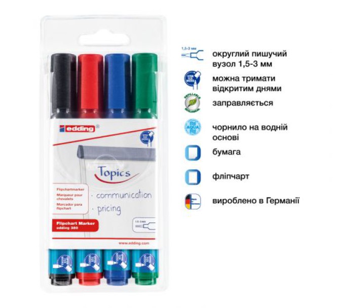 висихає, без, ковпачка, днів, для, написів, папері, для, фліпчартів, видах, паперу, чорнило, водній, основі, слід, чорнила, розпливається, просочується, крізь, папір, круглий, пишучий, вузол, сліду, edding, e-380/4/BL
