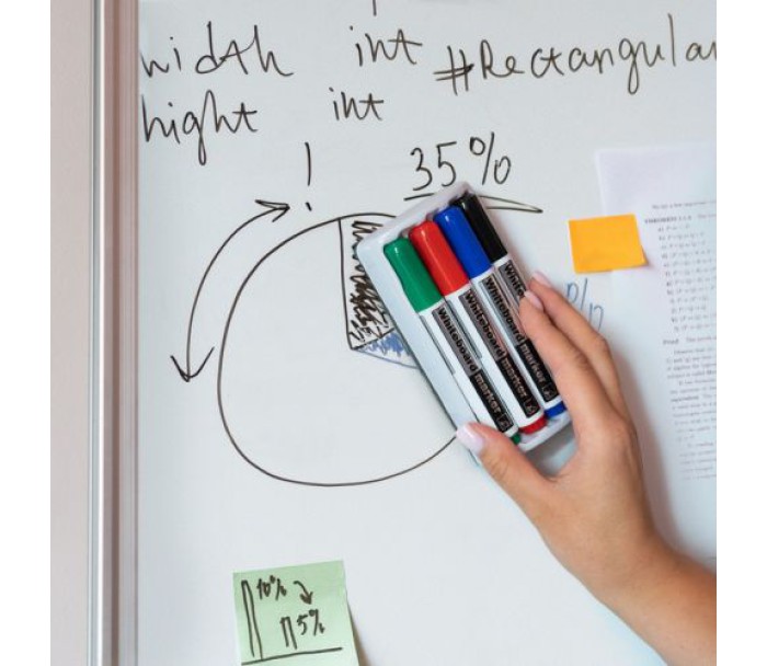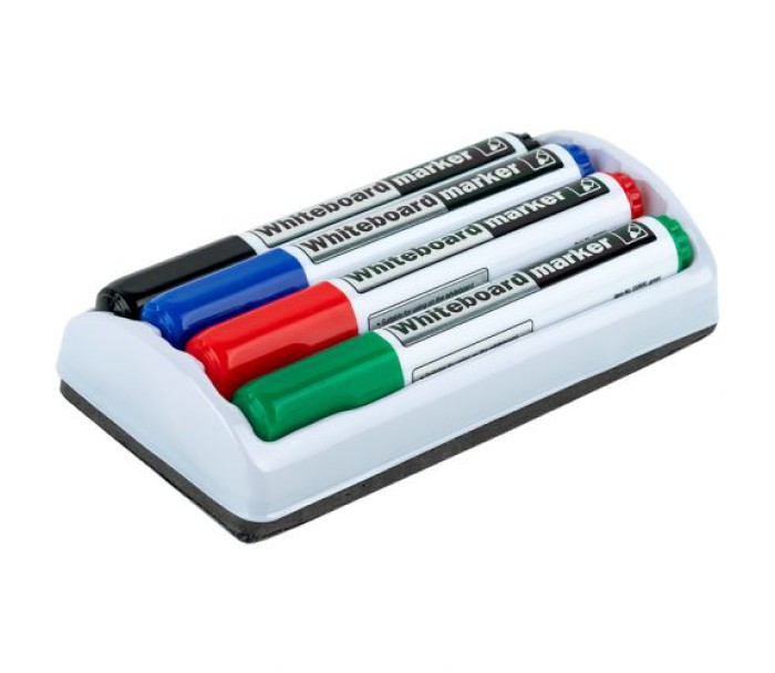 Маркери розміщені на пластиковому тримачі, який тримається на дошці за допомогою вбудованого магніту, а також слугує губкою для стирання написів з дошки.