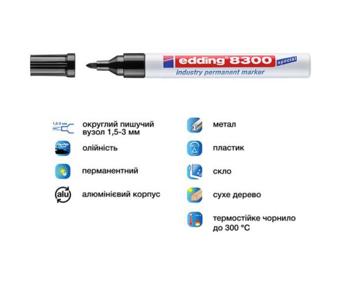 На відміну від звичайного перманентного маркера е-8300 має зміцнений, стійкий до стирання круглий пишучий вузол.