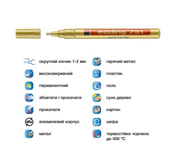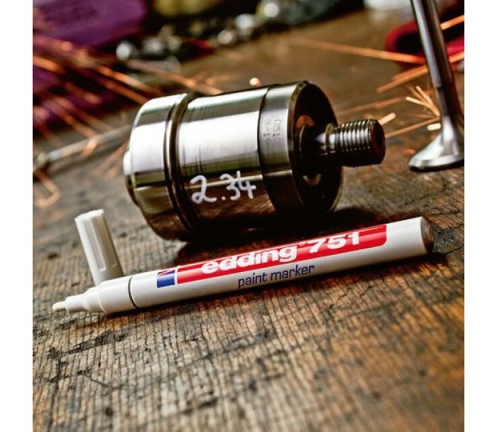 маркер, edding, paint, 751, підходить, для, нанесення, перманентного, маркування, які, поверхні, темні, прозорі, матеріали, метал, скло, пластик, має, лакове, термостійке, чорнило, 400, водостійке, швидко, сохне, вирізняється, світлостійкістю, зносостійкістю, містить, толуолу, ксилолу, практично, має, запаху, e-751/53