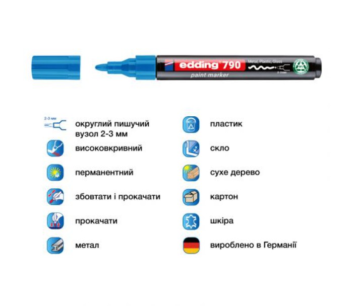 Лаковий маркер edding 790 забезпечує чітке, стійке маркування навіть на темних поверхнях. Завдяки густим чорнилам з високою покривною здатністю та округлому наконечнику (2–3 мм), він підходить для точного нанесення. Пише на таких матеріалах, як: метал, пластик, скло, суха деревина, картон, шкіра, лаковані поверхні. Маркер забезпечує довговічне та помітне покриття при використанні як в приміщеннях, так і на вулиці. Слід маркеру є волого-, зносо- , світло- та термостійким. Завдяки якісним чорнилам на спиртовій основі, слід маркеру швидко висихає та не розмазується. Ідеальний для виробництв, майстернь та побутових задач. Чорнила практично не мають запаху, не містять толуолу та ксилолу Виготовлений в Німеччині.