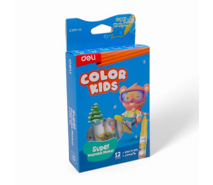 12 яскравих кольорів, що ідеально підходять для дитячої творчості. Корпус кожного фломастера має розмір D15×135 мм — зручний для дитячих ручок. Завдяки спеціальній формулі чорнил фломастери легко змиваються з рук і більшості тканин, що робить їх безпечними та практичними для використання вдома чи в дитячому садку.