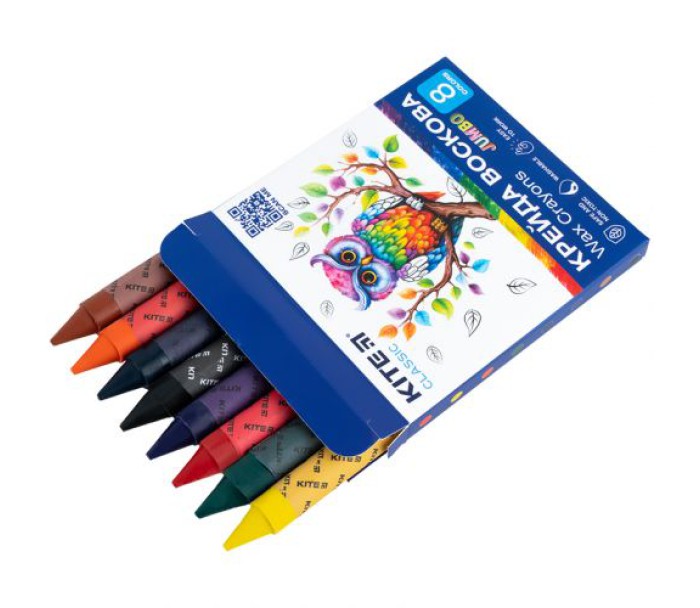 Кольорова воскова крейда Jumbo Kite Classic в яскравій картонній упаковці. Набір має таку палітру: помаранчевий, червоний, синій, чорний, жовтий, зелений, фіолетовий і коричневий кольори.