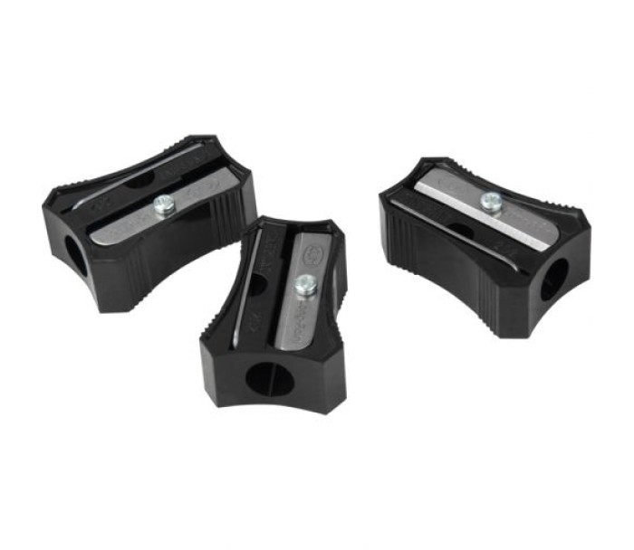 Пластикова точилка KUM без контейнера. Формує особливо довге вістря. Прямокутна форма корпусу з виїмками для пальців. Рекомендується для креслярських і художніх робіт. У комплекті з точилкою - запасне лезо. Колір: чорний.