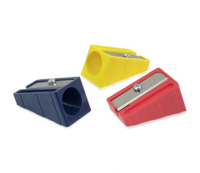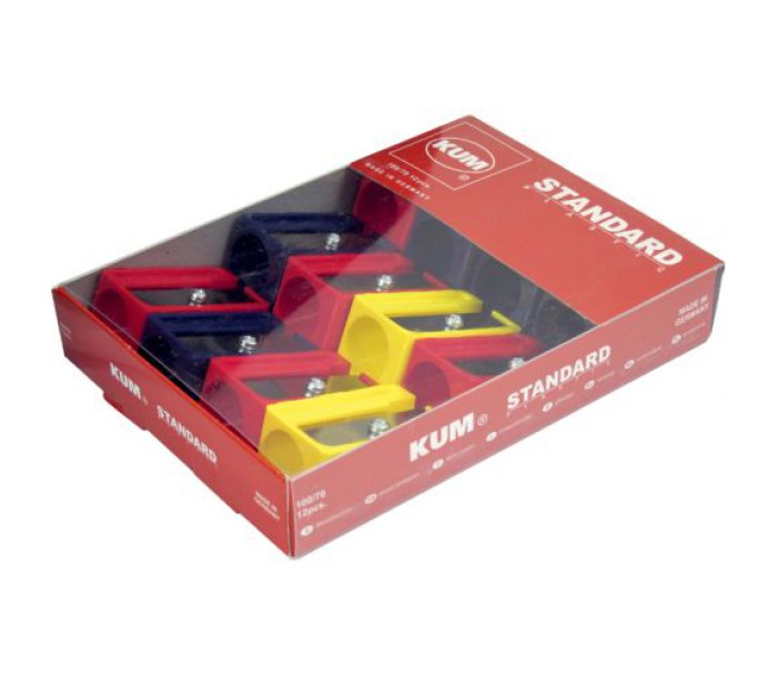 Пластикова точилка KUM для заточування великих олівців (діаметром 11-17 мм), а також олівців нестандартної форми (наприклад, теслярських олівців). Надгострі вигнуті леза з легкістю заточують будь-які олівці, навіть олівці поганої якості. Корпус з первинного пластику дуже міцний, виконаний максимально точно. Леза захищені від іржі. Клиноподібна форма. Асорті класичних кольорів: синій, жовтий, червоний.