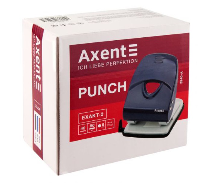 діркопробивач, exakt, металевої, міцний, металевий, корпус, надійний, механізм, комфортну, роботу, діркопробивача, довговічність, при, інтенсивному, навантаженні, леза, залишаються, гострими, для, зручності, оснащений, висувною, обмежувальною, лінійкою, шкалою, форматів, паперу, висувна, AXENT, 3940-01-A