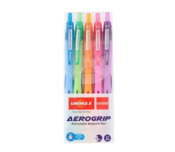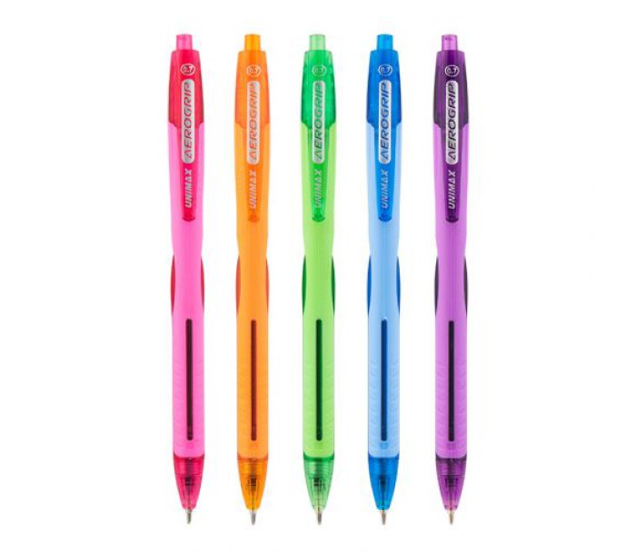 Набір автоматичних кулькових ручок з непрозорим прогумованим пластиковим корпусом, напівпрозорими вставками і пластиковим кліпом. Чорнило підвищеної в'язкості забезпечує суперм'яке письмо. Колір корпусу відповідає кольору чорнила. 5 кольорів: рожевий, світло-зелений, світло-блакитний, помаранчевий, фіолетовий. Пишучий вузол 0,7 мм. Стержень UXB-137. Довжина стержня 107 мм.