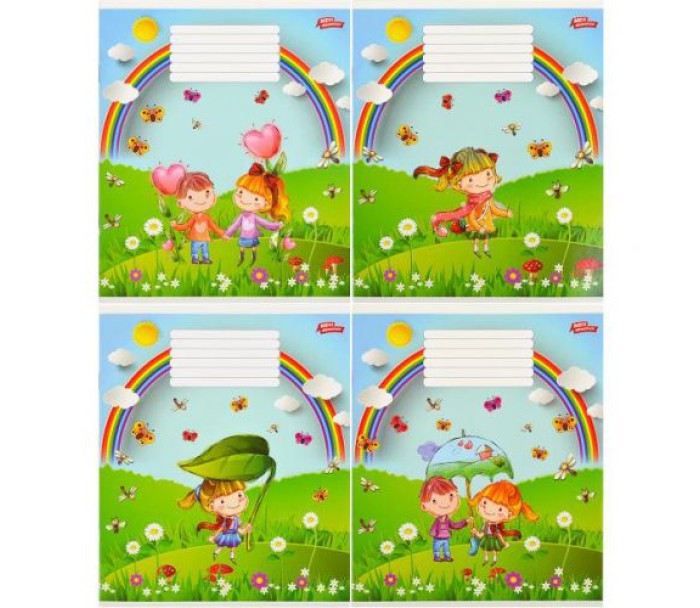Зошит шкільний на скобі має 12 аркушів, представлений у зручному форматі А5. Аркуші в зошиті зроблені зі щільного паперу, розлініяні в лінію. Виріб представлено в ущільненій кольоровій обкладинці у 4 яскравих дизайнах. Продаються комплектом 20 штук в упаковці.