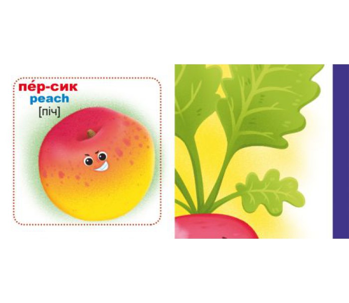 Набір розумних карток, які допоможуть малюкові дізнаватися назви різних фруктів і овочів за допомогою гри. Картки на двох мовах і з транскрипцією (укр, англ).