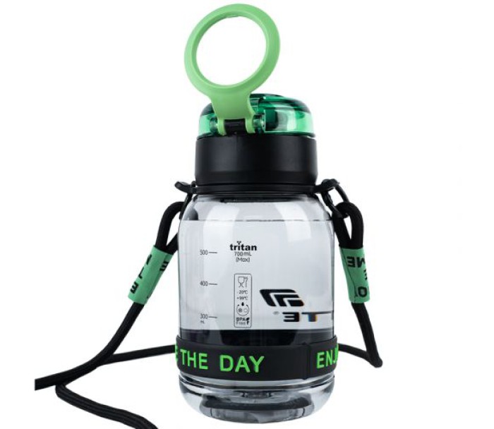 Пляшечка для води виготовлена з тритану. Тритан - надійний, міцний, безпечний пластик без запаху та смаку. Особливості: • тритан — безпечний матеріал, не містить бісфенол-А, зберігає смак напоїв; • об’єм 700 мл — достатньо рідини на тривалий час; • кнопка відкриття + фіксатор — зручно та надійно; • знімний ремінець — пляшку легко носити з собою; • стильний дизайн із написом — мотивує насолоджуватись моментом.