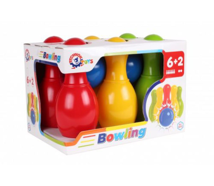 Яскравий пластиковий набір для боулінгу. У комплекті: 6 кеглів і 2 кулі для боулінгу. Розмір кеглів: 19 см, діаметр кулі: 8 см.