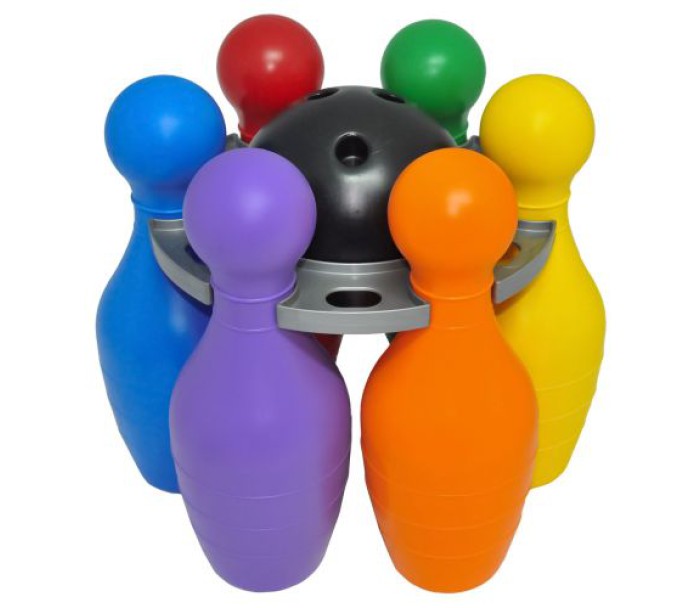 Ігровий набір боулінг включає: 6 кеглів і кулю для гри, все це на зручній підставці. Розмір однієї кеглі - 11х3011 см. Діаметр кулі - 14 см. Виконано з якісного та міцного пластику.