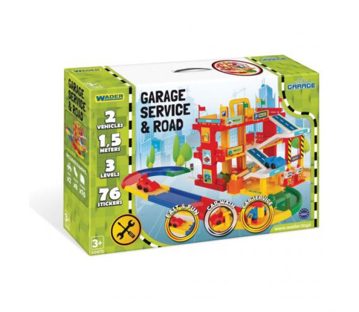 Яскравий ігровий набір "Сервіс" буде незабутнім подарунком дитині. У наборі є: 2 машинки, 3-х поверховий гараж, дорога 1,5 метра, наклейки для елементів гаража, елементи декору (прапорці, дерева). Сервіс оснащений мийкою, паркуванням, спуском для машин між поверхами, сервіс ремонту. Виконаний з якісного та міцного пластику. Для дітей від 3-х років.