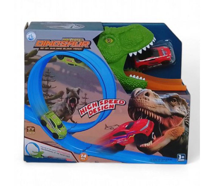 Дитячий трек із інерційною машинкою. Машина розганяється, на великій швидкості входить у пащу динозавра, робить запаморочливі перевороти в петлі та вилітає з треку. Машинка пластикова. Трек складається із 14 елементів. Розмір у зібраному вигляді – 85 х 10 х 27 см.