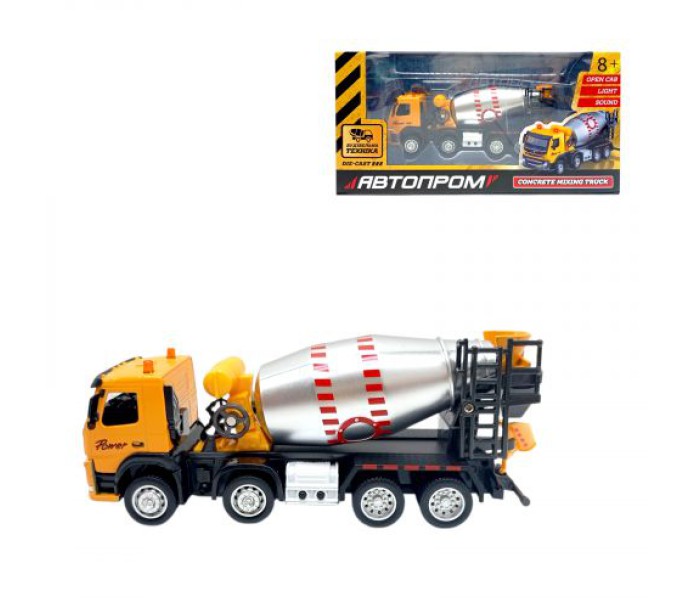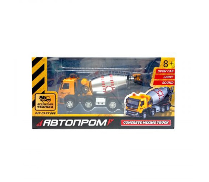 Будтехніка мет. АВТОПРОМ VOLVO Автобетонозмішувач, бат,світло,звук,рухливі деталі,у короб. 28*14*10см