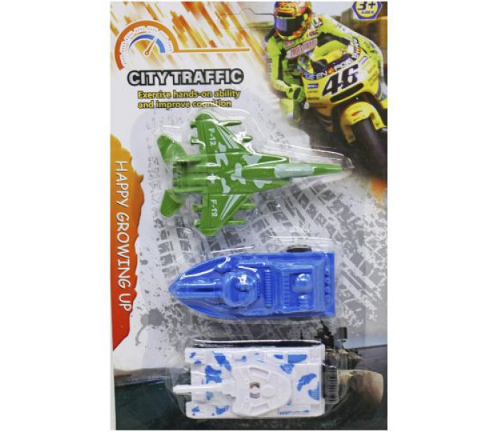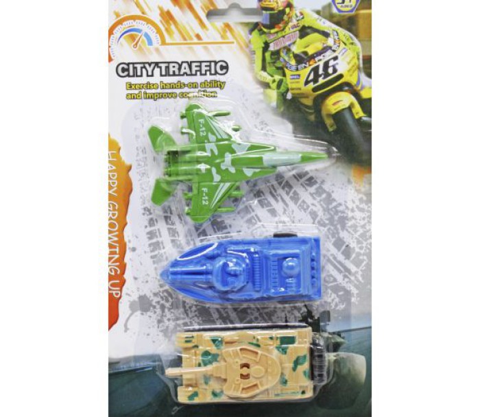 Набір з 3 пластикових машинок - танк, катер і літак винищувач. Дитина зможе влаштовувати баталії чи перегони з друзями. Допоможе розвивати логічне мислення, візуальне сприйняття, дрібну моторику та координацію. Іграшки виконані із міцного пластику. Розмір однієї іграшки: 10х7х3 см. Різні кольори в асортименті.