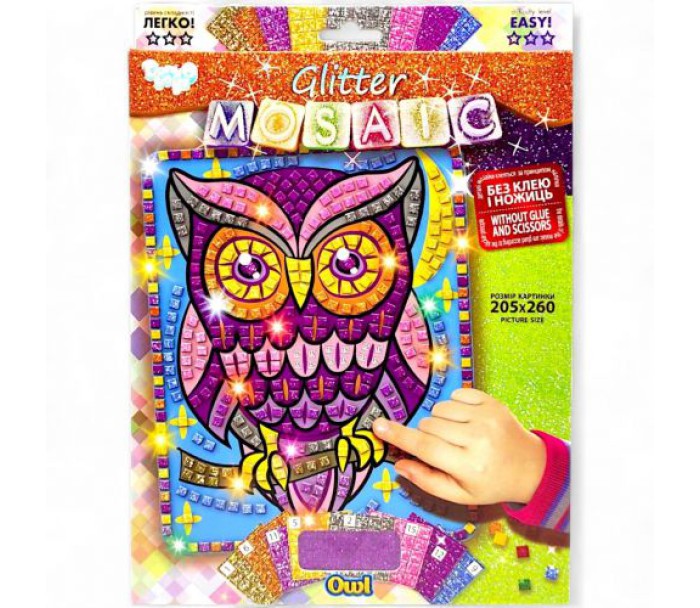 Набір для творчості "Блискуча мозаїка". Розвиває креативне мислення, творчі здібності, художній смак. Інструкція: 1) Беремо картинку і палетку з наклейками; 2) Підбираємо палетки з наклейками згідно з номерами, вказаними на коробці; 3) Відокремлюємо кубики-наклейки від палеток і клеїмо їх на зазначені номери картинки; 4) З решти наклейок оформляємо рамку до готової мозаїці. Без клею і ножиць. Розмір картинки - 20,5 х 26 см.