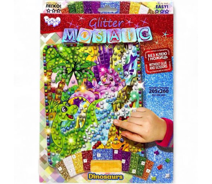 Дитячий набір для творчості "Блискуча мозаїка". Метод створення картин за номерами дуже простий і доставить масу задоволення. Зазначені на схемі кольору рекомендовані для отримання результату, зображеного на упаковці. Картину, так само, можна прикрасити гліттернимі наклейками на свій розсуд. Розмір картинки: 20,5х26 см.