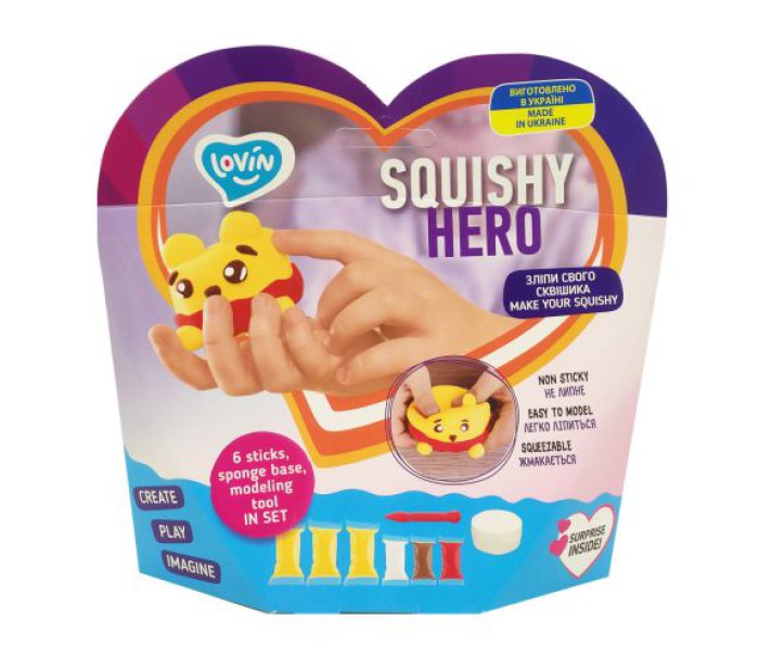 У наборі для ліплення серії "Squishy Hero" є всі необхідні матеріали для того, щоб зліпити милу іграшку-сквіш. У комплекті є 6 стиків повітряного тіста (3 стрики по 6 грамів, 3 стіки по 4 грами), інструкція, губка-основа та стек для моделювання. Набір призначений для розвитку дрібної моторики та творчих здібностей дитини. Для дітей віком від 3-х років.