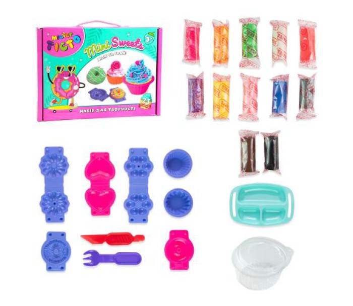 Комплектація: 12 стіків тіста для ліплення, упаковка для виробів із тіста, 10 інструментів для ліплення