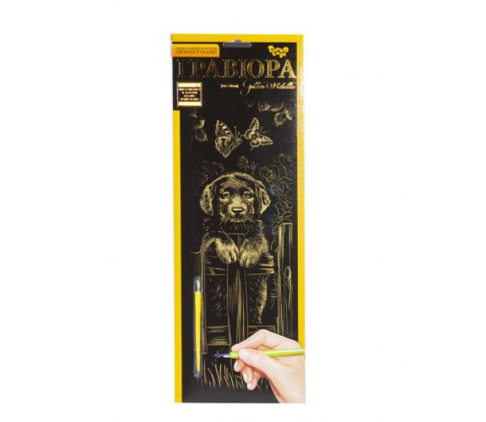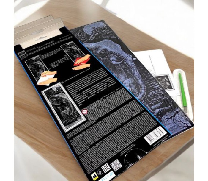 За допомогою штихеля можна провести по контуру малюнка лінії, поступово створивши зображення. В процесі роботи розвивається кисть, вигострюються руху пальців. У наборі: основа з нанесеним контуром, штихель. Розмір готової роботи: 41 х 15 см.