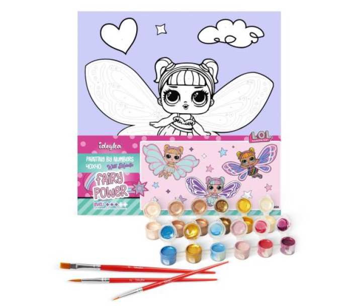 Серія L.O.L. Surprise! O.M.G. Fairies - це магічна колекція, де персонажі нагадують казкових істот, із блискучими деталями, перламутровими акцентами та казковими аксесуарами. Набір для творчості з красивим сюжетом на полотні і всім необхідним для створення готової картини містить: натуральне полотно на підрамнику із галерейною натяжкою; 3 нейлонові художні пензлики; палітра пронумерованих, акрилових фарб в контейнерах; інструкція. На картині нанесена схема контурів зображення з нумерацією. Сегменти додатково пофарбовані в тон кольорів, якими необхідно зафарбовувати полотно.