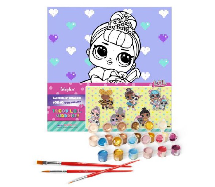 Серія L.O.L. Surprise! TroopSurprise - це лімітована серія ляльок, які мають пухнастих та дуже модних компаньйонів. Набір для творчості з красивим сюжетом на полотні і всім необхідним для створення готової картини містить: натуральне полотно на підрамнику із галерейною натяжкою; 3 нейлонові художні пензлики; палітра пронумерованих, акрилових фарб в контейнерах; інструкція. На картині нанесена схема контурів зображення з нумерацією. Сегменти додатково пофарбовані в тон кольорів, якими необхідно зафарбовувати полотно.