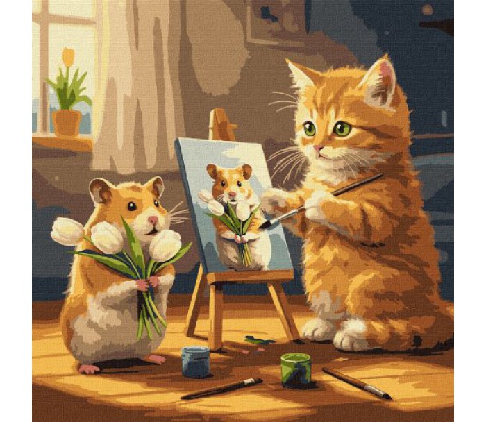 Комплектація: полотно на підрамнику з галерейною натяжкою, паперовий дублікат з контурним малюнком картини (на картині нанесена схема контурів зображення з нумерацією), художні нейлонові пензлі, палітра акрилових фарб у контейнерах