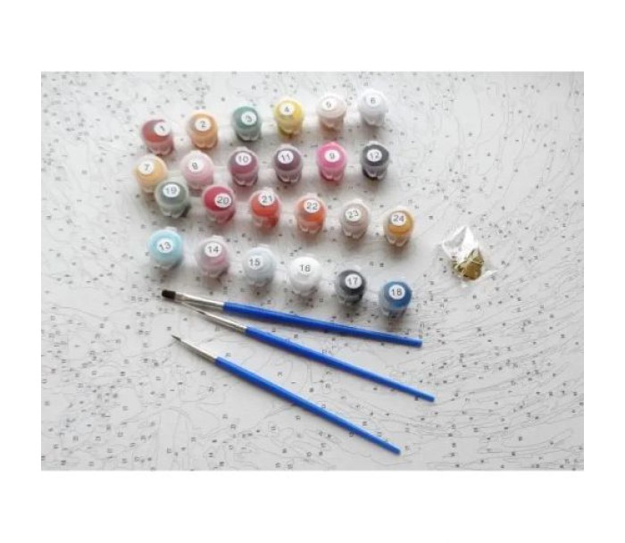 Картина за номерами. Для того, щоб намалювати картину, необхідно малювати за пронумерованими контурами, які відповідають кольору фарби. У наборі: полотно на підрамнику з галерейною натяжкою, паперовий дублікат з контурним малюнком картини (на картині нанесена схема контурів зображення з нумерацією), художні нейлонові пензлі, палітра акрилових фарб у контейнерах. Усі необхідні фарби вже в комплекті та не вимагають змішування. Розмір: 40х50 см.
