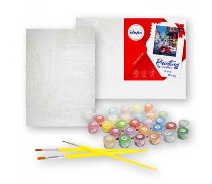Комплектація: Полотно на підрамнику з галерейною натяжкою, паперовий дублікат з контурним малюнком картини (на картині нанесена схема контурів зображення з нумерацією), художні нейлонові пензлі, палітра акрилових фарб у контейнерах