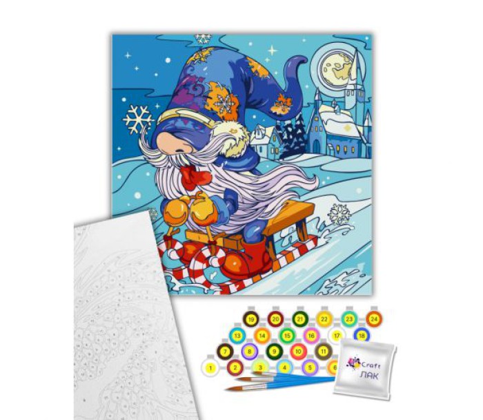 Картина за номерами. Для того, щоб намалювати картину, необхідно малювати за пронумерованими контурами, які відповідають кольору фарби. У наборі: полотно на підрамнику з галерейною натяжкою, паперовий дублікат з контурним малюнком картини (на картині нанесена схема контурів зображення з нумерацією), художні нейлонові пензлі, палітра акрилових фарб у контейнерах. Усі необхідні фарби вже в комплекті та не вимагають змішування. Розмір: 40х40 см.
