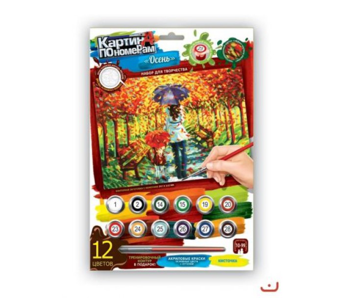 Картина за номерами (297х210 мм). У наборі: 12 акрилових фарб (основні кольори + відтінки), пензлик, контурна заготовка 2 шт., Інструкція.