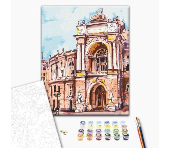 Комплектація: Полотно на підрамнику з галерейною натяжкою, паперова інструкція з контурним малюнком картини, нейлонові пензлі, палітра акрилових фарб у контейнерах, кріплення