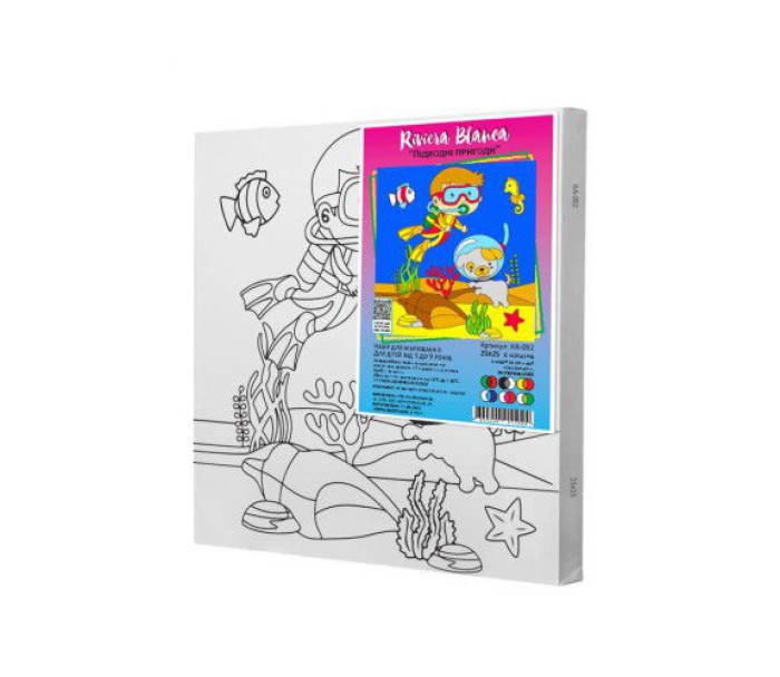 Комплектація: синтетичне полотно з нанесеними контурами майбутнього малюнка, натягнуте на дерев'яну рамку; водорозчинні акрилові фарби; пензлик