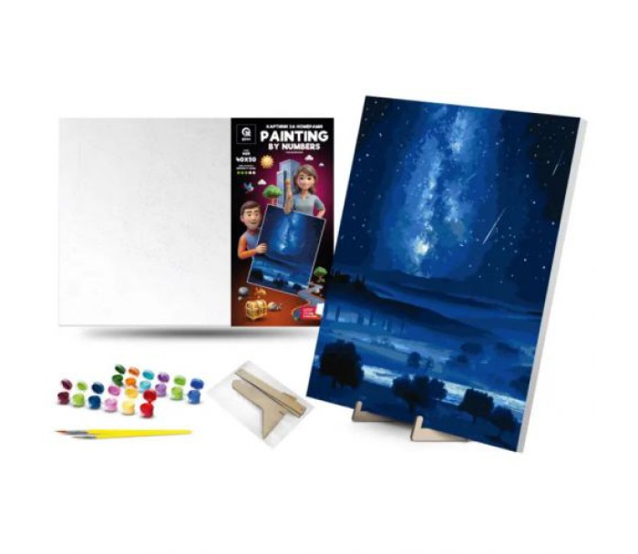 Комплектація: полотно на підрамнику з галерейною натяжкою, художні нейлонові пензлі, палітра акрилових фарб у контейнерах, дерев'яні деталі підставки для картини.