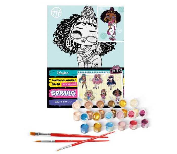 L.O.L. Surprise! O.M.G. Tweens - це енергія, креативність і експерименти з модою. Картини серії Tweens - вибух кольору та деталей, що передають харизму ляльок: модний одяг, трендові аксесуари, стильні образи. Набір для творчості з красивим сюжетом на полотні і всім необхідним для створення готової картини включає: натуральне полотно на підрамнику із галерейною натяжкою; 3 нейлонові художні пензлики; соковита палітра пронумерованих, акрилових фарб в контейнерах. На полотні нанесена схема контурів зображення з нумерацією. Окремі сегменти додатково пофарбовані в тон кольорів, якими необхідно зафарбовувати полотно. У наборі металізовані акрилові фарби та звичайні акрилові фарби.