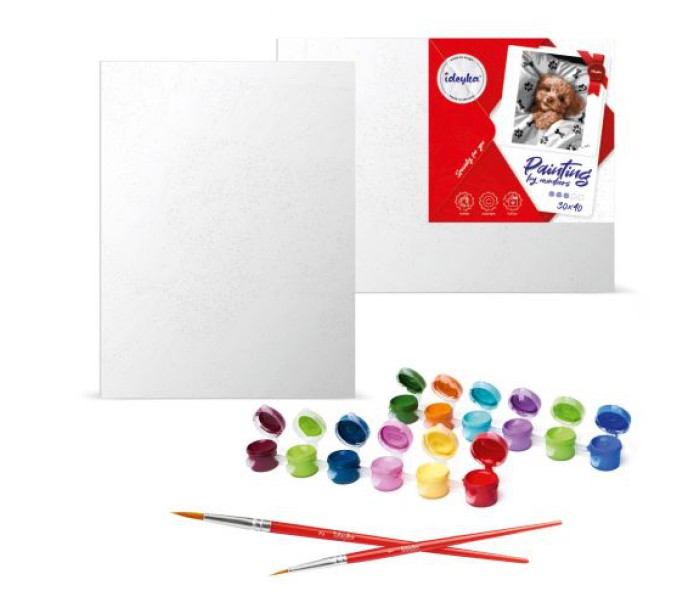 Комплектація: полотно на підрамнику з галерейною натяжкою, паперовий дублікат з контурним малюнком картини (на картині нанесена схема контурів зображення з нумерацією), художні нейлонові пензлі, палітра акрилових фарб у контейнерах