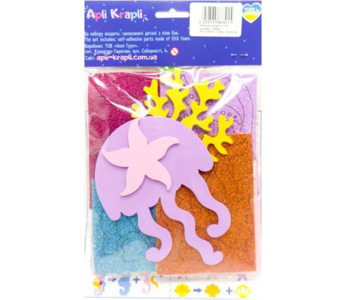 Набір для творчості "3D аплікація" від українськаго бренду Аплі Краплі. З деталей набору можна створювати яскраві та незвичайні поробки-аплікації. До комплекту входить все необхідне: самоклеючі деталі з EVA та двосторонній скотч. На упаковці зображено покрокову інструкцію. Рекомендовано для діток старше 3-х років.