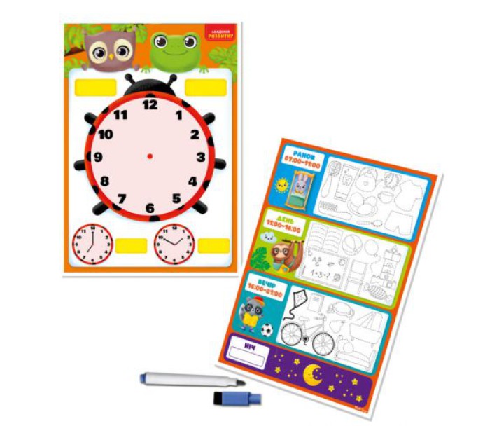Розвиваюча дошка-тренажер для найменших. На одному боці зображений годинник, на якому дитина зможе малювати стрілочки маркером, що стирається, а на другій - розпорядок дня і пунктирні зображення різних занять, відповідних часу доби. Дитина зможе обводити лінії маркером та вивчати назви різних предметів. Розмір дошки: 24х34 см.