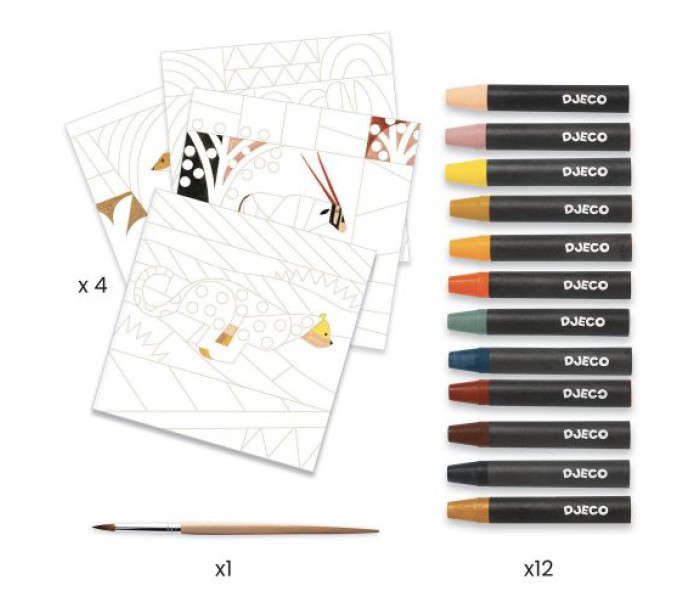 Комплектація: - 4 ілюстровані картки (20 х 20 см); - 12 акварельних воскових олівців; - 1 пензлик; - 1 кольоровий буклет з покроковими поясненнями.