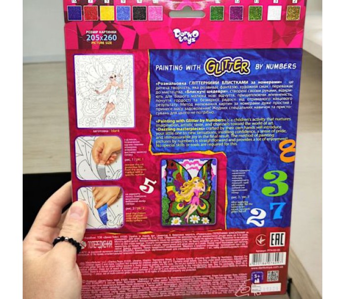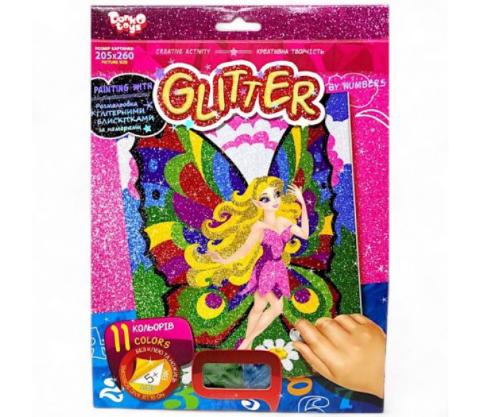 Набір для творчості "Розмальовка глітером". Набір розвиває фантазію, художній смак і преобщает до мистецтва. На заготівлі нанесені цифри, які відповідають кольорам пакетиків з блискітками. Відокремлюючи захисний шар певного кольору засипте його глітером. 11 кольорів.