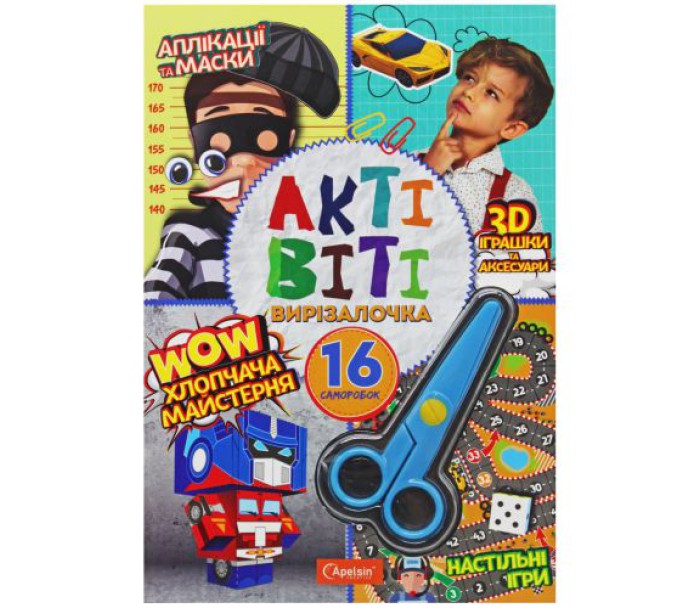 Незвичайна і захоплююча книга саморобок "Актівіті-вирізалочка". Тут зібрані найцікавіші колекції готових ідей, щоб власноруч зробити саморобки, 3д іграшки, маски, аксесуари, ігри, листівки та інші цікавинки. Створюй круті саморобки весело та просто: вирізай вже готові елементи й послідовно дотримуйся інструкції. Нічого не треба придумувати, або шукати додаткові деталі чи матеріали, просто вирізай - згинай - приклеюй - грайся. Тобі в допомогу зразок-підказка готового виробу, при потребі паперові заготовки можна наклеїти на картон. Ножиці вже є в наборі.