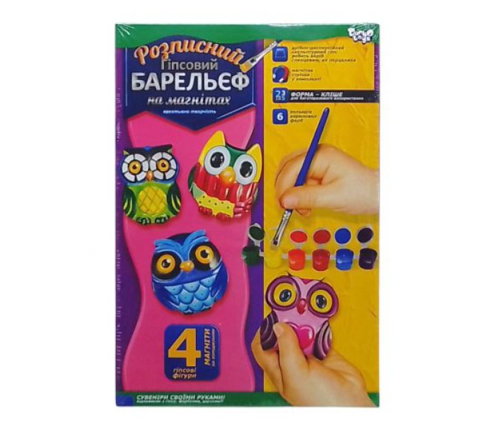 Комплектація: Форма для 4-х фігур, гіпсовий порошок, 6 кольорів фарби, пензлик, магнітна стрічка, інструкція