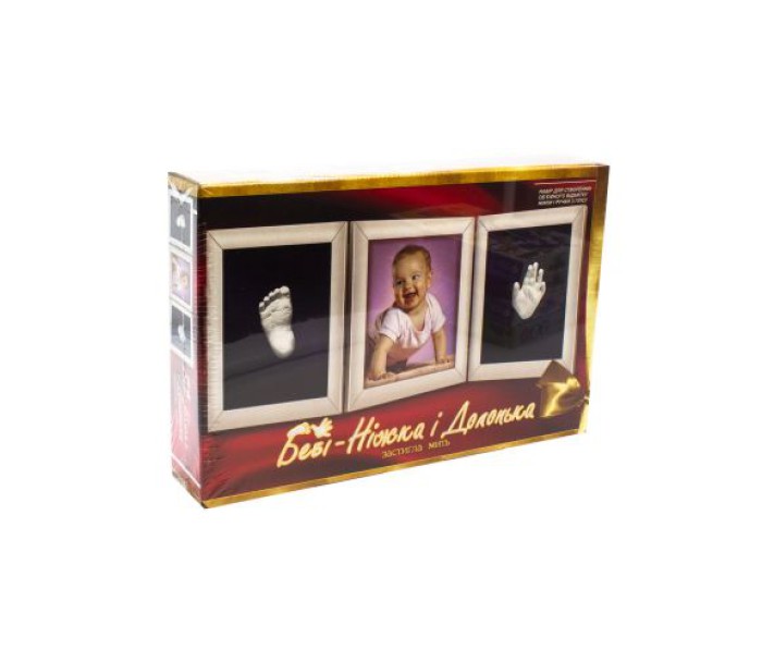 Набір для творчості "Бебі-Ніжка і Долонька". Ви легко зможете створити унікальну сімейну цінність, яка дозволити зберегти неповторні миті дитинства Вашого малюка. У комплекті: моделюючий гель, порошковий гіпс, контейнер-форма для відбитка долоні, потрійна багетна рамка (18 х 13 см), паспарту, кріпильна дріт.