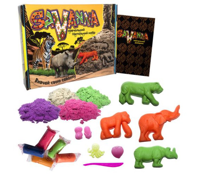 Навчальний тактильний набір "Savanna". У комплекті: кінетичний пісок (4 кольори по 350 г), тісто для ліплення (5 кольорів), контейнер для зберігання тіста, навчальний посібник і картки, пасочки для піску і тіста (8 шт) і стек. Кінетичний пісок схожий на звичайний вологий пісок, але разом з цим він абсолютно сухий, приємний на дотик, повітряний і м'який, тече крізь пальці, залишаючи долоні сухими і чистими, прекрасно зберігає форму під час ліплення. Тісто для ліплення добре тримає форму і не прилипає до рук. За допомогою набору, дитина з легкістю зможе вивчити нових тварин і інформацію про них. На картках є невеликі замітки, що розповідають про мешканців савани. Доповнити навчання наочним прикладом допоможуть фігурки тварин, зроблені своїми руками з кінетичного піску та тіста.