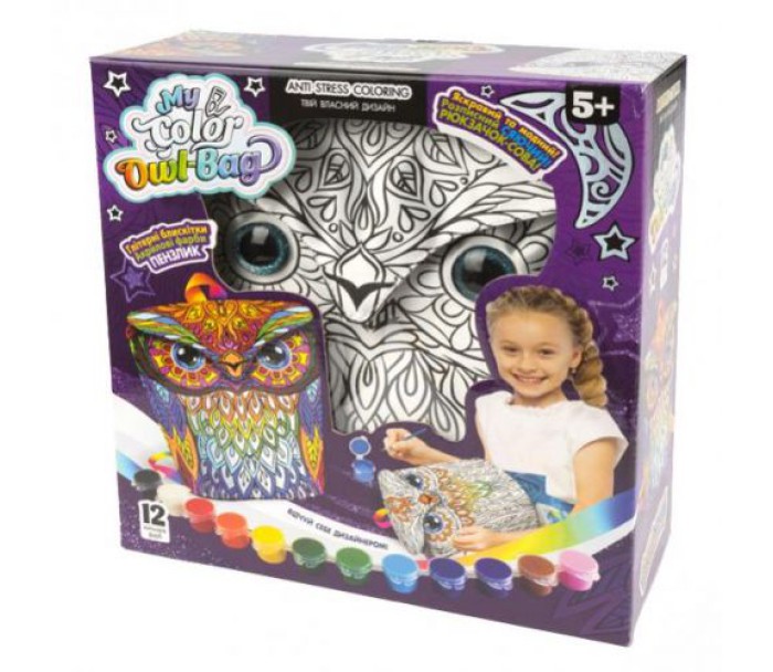 Цікавий набір для творчості, який допоможе розвивати у дитини сприйняття кольору, креативність, а також є відмінним антистрес. У наборі є рюкзачок-сова, який дитина зможе розфарбувати так, як йому подобається і прикрасити. Так само, є палітра фарб на 12 кольорів, блискітками, акриловий лак і пензлик. Виконано набір з якісних і безпечних матеріалів. Для дітей від 5 років.